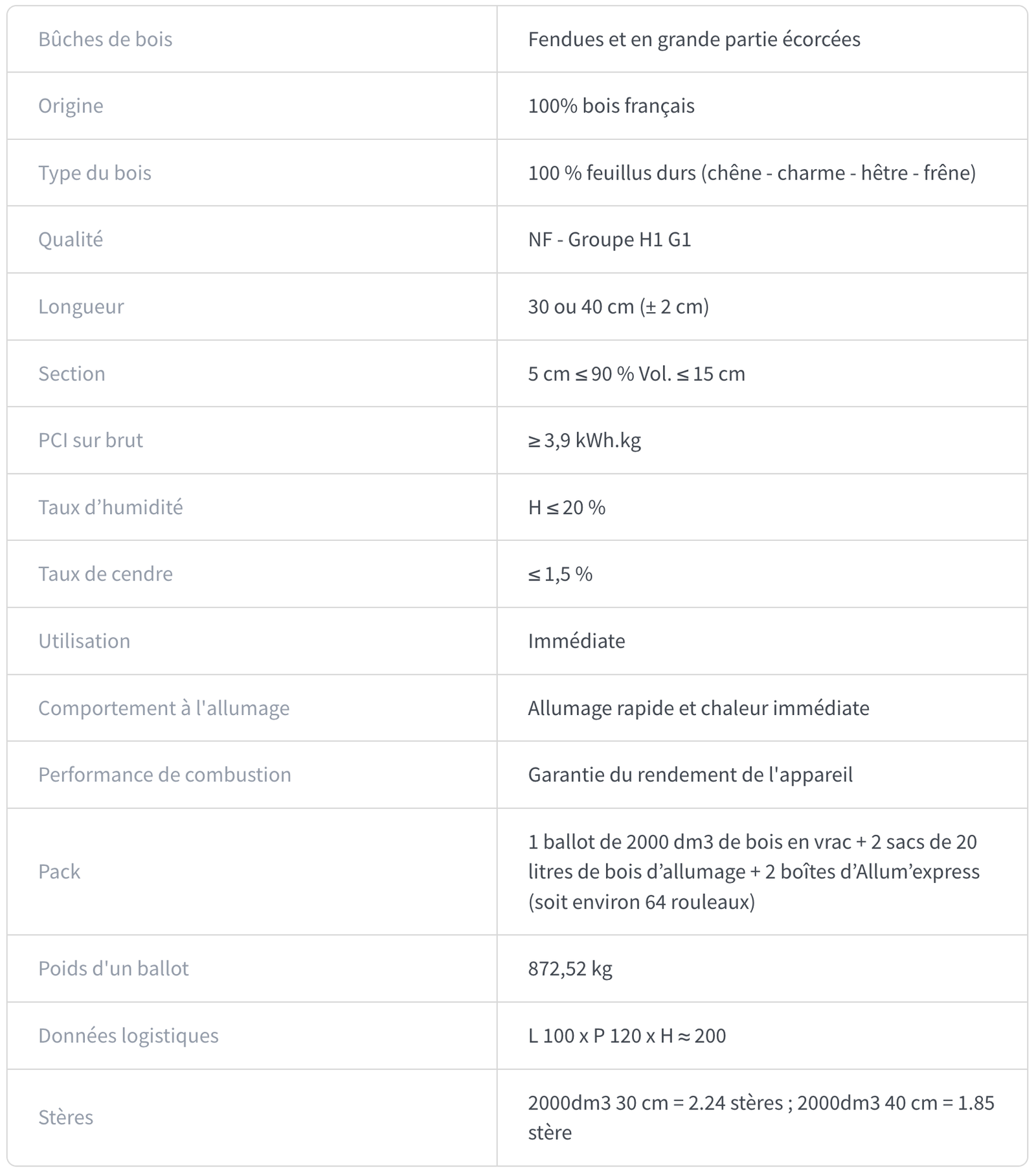 Les bûches haute performance révolutionnent le bois de chauffage. Issu des meilleures essences de feuillus durs (chêne, charme, hêtre, frêne), elles sont fendues et séchées à un taux d’humidité inférieur à 20 %. Ce bois sec garantit le rendement maximum de votre appareil avec 30% de consommation en moins par rapport au bois du commerce contenant 35% d’humidité ou séché pendant 12 mois !