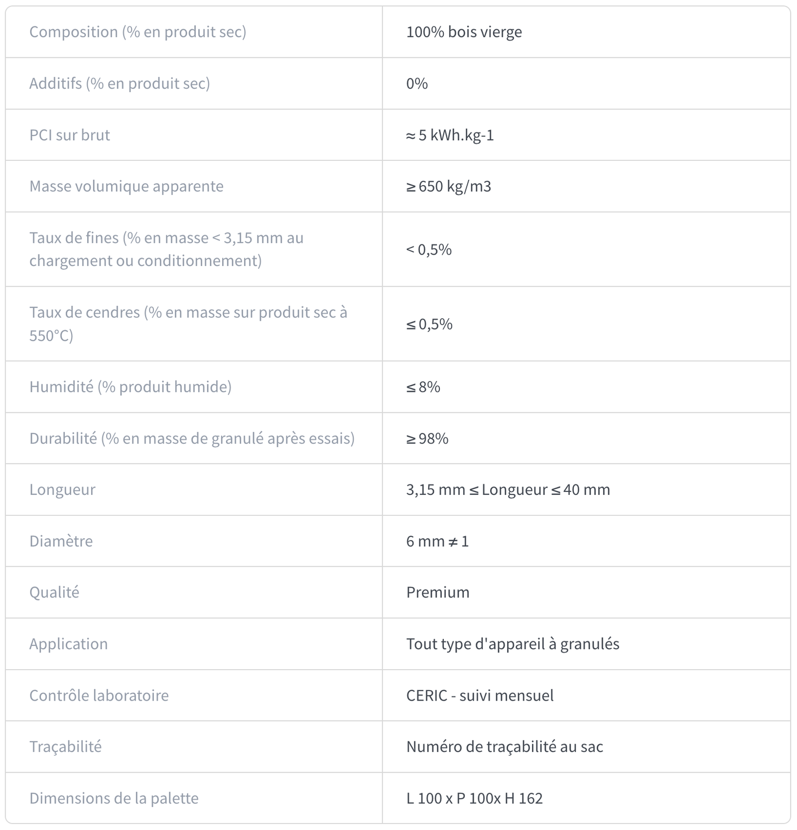 La granulométrie constante et régulière de nos pellets vous assure un écoulement aisé de la vis sans fin. Leur très faible taux de cendre permet aussi de rallonger la durée de vie de votre installation. Ainsi, le rendement maximal de votre appareil sera garanti, notamment grâce à leur PCI brut ≈ 5 kWh.kg-1 et leur taux d’humidité ≤ 8 %.